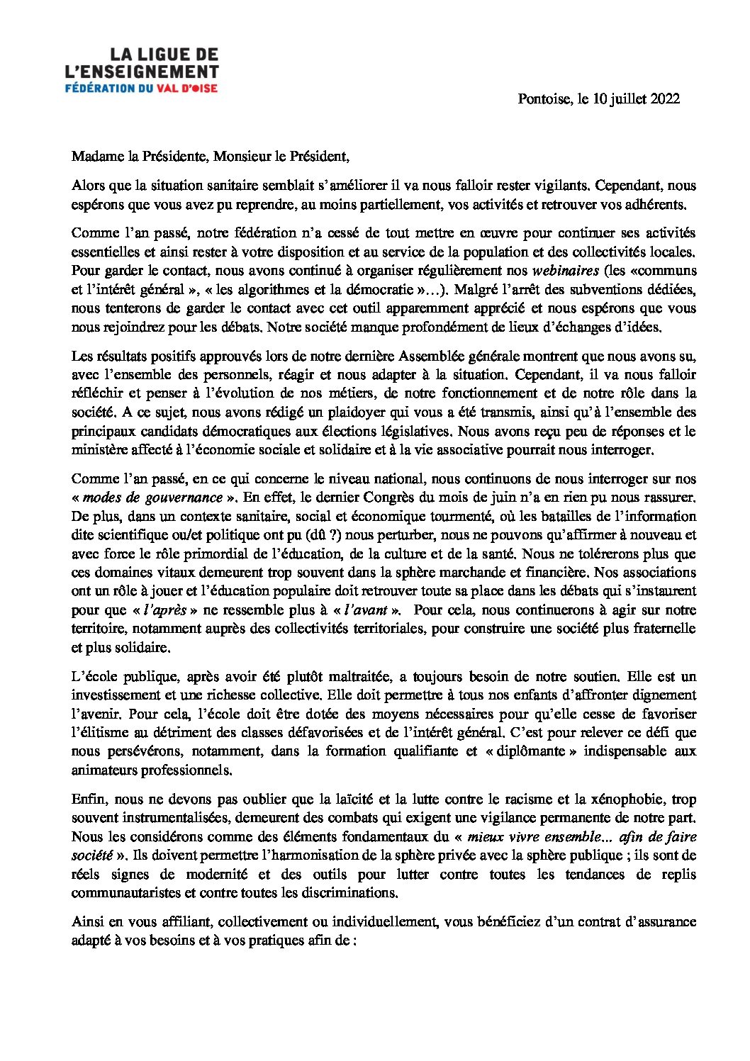 La lettre du Président 2022/23 A l’attention des dirigeants d’association |
