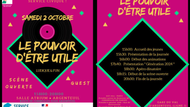 Sous la dénomination #LepouvoirDêtreUtile, les événements de promotion du service civique se multiplient en cette période de rentrée. Le 2 octobre à Argenteuil, le pôle d’appui départemental organise un grand rendez-vous avec la Mission locale, Pôle emploi et la participation de la municipalité. Au menu : séances de brainstorming, débats mouvants, jeux de rôle et stands,…