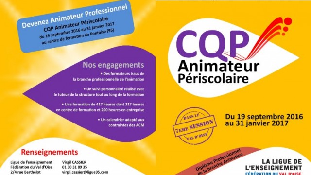Le Certificat de Qualification Professionnel « Animateur Périscolaire » s’est inscrit depuis plus de deux ans comme une référence des diplômes de l’animation professionnelle. Preuve du succès de ce diplôme, 6 sessions organisées en 2 ans dans le Val d’Oise. Notre 7ème session se déroulera : Du 19 septembre 2016 au 31 janvier 2017 Au centre de formation…