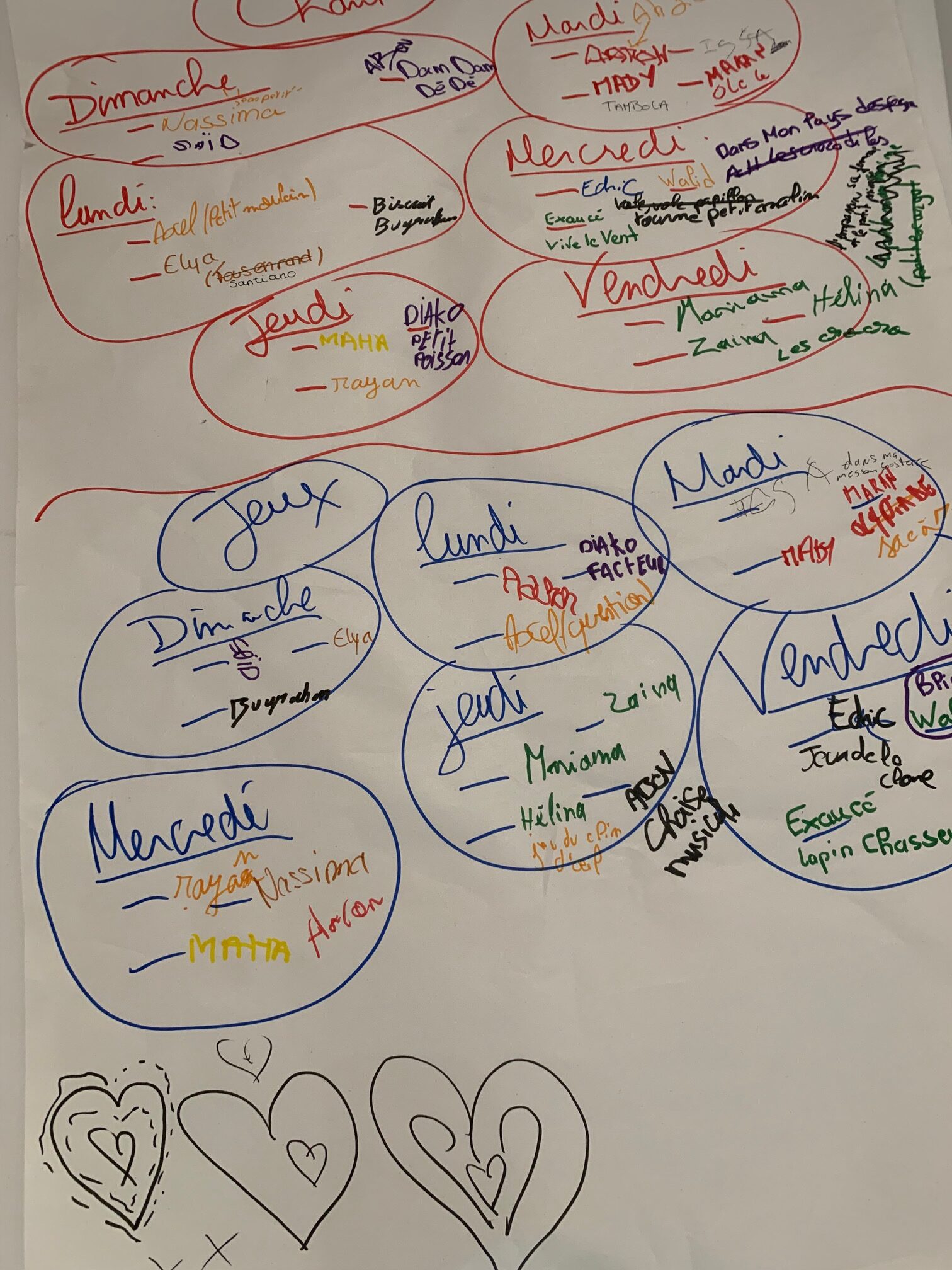 Une éclaircie météo permet de tester les participants dans leur aptitude à imaginer un jeu de plein air. Au retour en salle, le groupe est invité à tirer le bilan de ses propres propositions et de celles des autres. « Travaillez l’imaginaire », conseille Hawa. « Ayez bien conscience que tout le cadre du jeu que vous instituez doit être posé à partir des règles. Comment vos 6-9 ans vont se déplacer d’un stand à l’autre ? », interroge Florent.