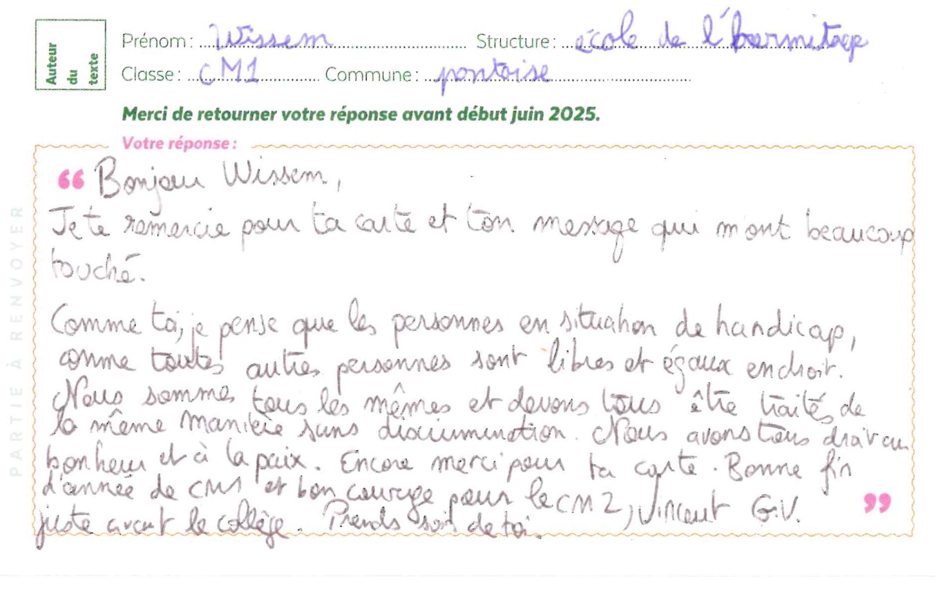 Celle-ci avait diffusé un millier de cartes postales, dans une dizaine d’établissements scolaires. Des réponses commencent à arriver à la Ligue 95, qui les renverra aux enfants. Ainsi, Wissem, du CM1 de l’école de l’Hermitage à Pontoise a reçu un joli message de Vincent : « comme toi, Wissem, je pense que les personnes en situation de handicap, comme tout le monde, sont libres et égales en droits. Nous sommes tous les mêmes et devons être traités de la même manière. Nous avons tous droit au bonheur et à la paix. Encore merci pour ta carte ».
