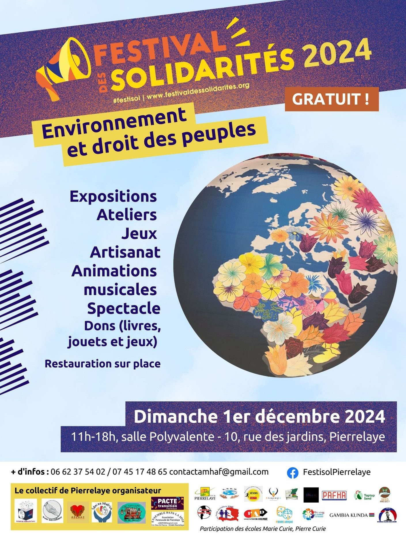 Le Festival des solidarités fait étape à Pierrelaye le 1er décembre. Rendez-vous entre 11h et 18 h à la salle polyvalente où de nombreuses animations et ateliers attendent les habitants autour de la solidarité internationale, de l’environnement et du droit des peuples. Entrée libre. Pour en savoir plus : https://www.festivaldessolidarites.org