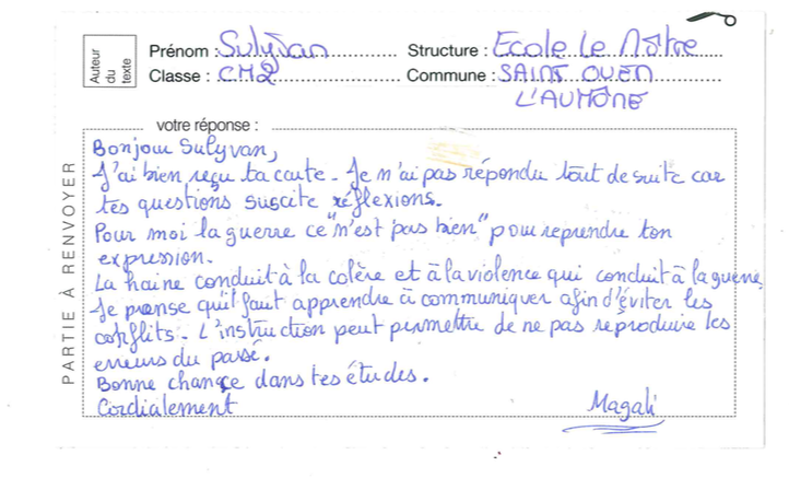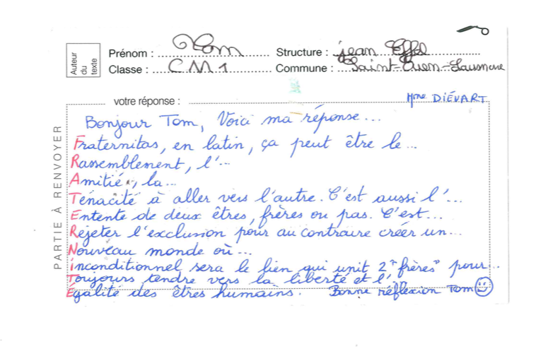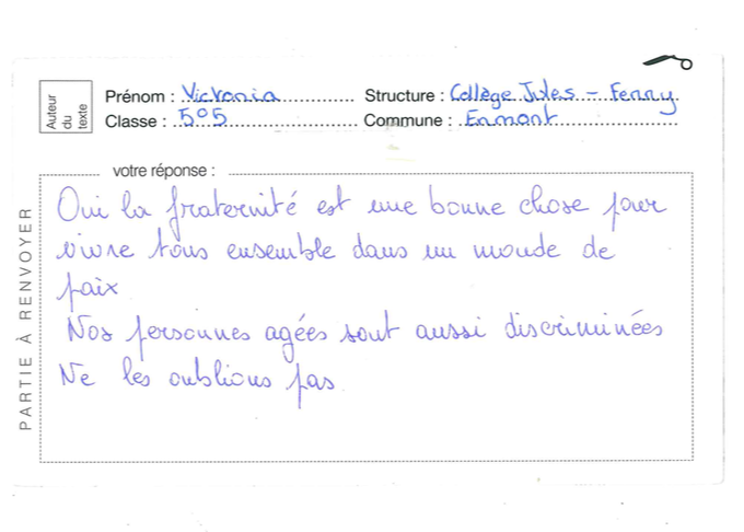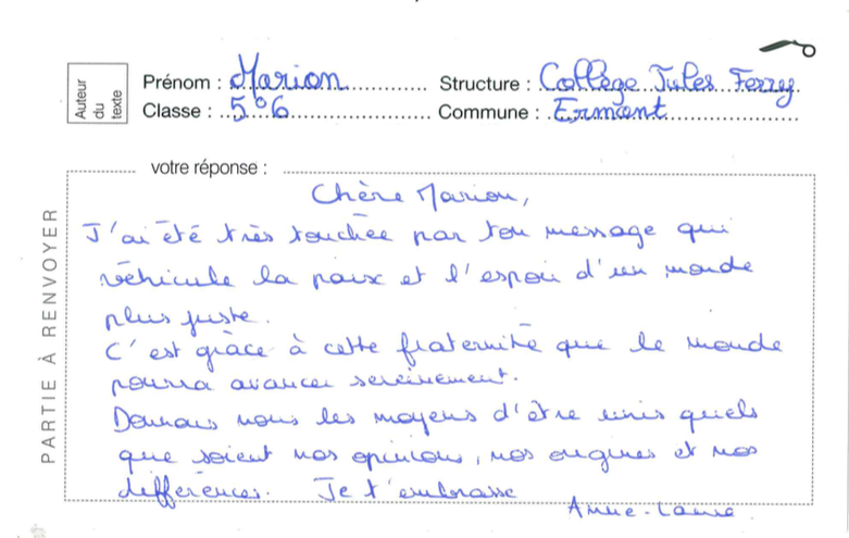 Voici quelques exemples de réponses adressées aux enfants suite à la réception de leur message de fraternité :