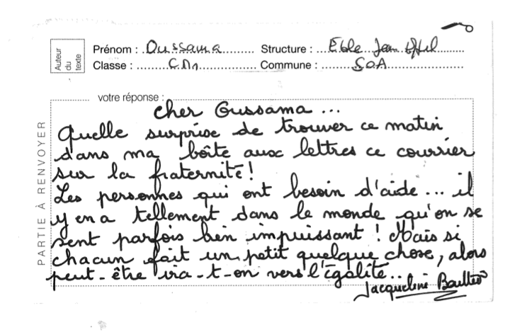 Rappel : Des cartes postales reproduisant des photos d’artistes et sur lesquelles des jeunes rédigent un message de fraternité, sont adressées au hasard aux habitants de leur département. Cette idée simple à mettre en œuvre, poétique et politique manifeste notre engagement pour une éducation à l’égalité dans la diversité, à la lutte contre les discriminations.