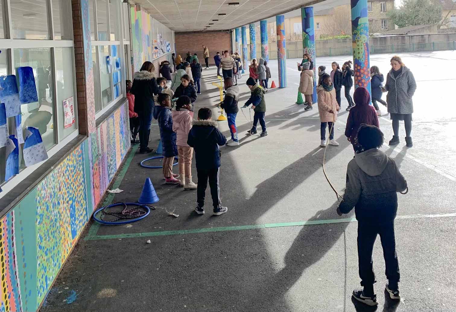 Les rencontres sont structurées par thématiques : le saut, le lancer, l’équilibre, etc. Pour pimenter le tout, l’Usep 95 utilise l’outil interactif de son action « Les enfants font leurs jeux ». Les scores de tous les participants sont enregistrés, avec l’objectif d’atteindre le nombre 2024. Il s’agit bien sûr, pour chaque demi-journée, d’une comptabilité cumulée, à l’échelle de chaque école primaire participante.