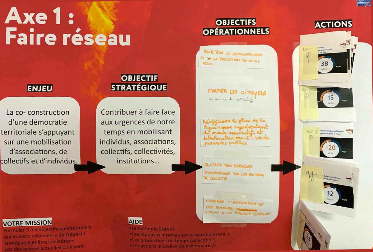 Répartis en trois groupes de travail – un par axe stratégique -, ils avaient pour mission de formuler des objectifs opérationnels. Avec une solide méthodologie d’animation de groupe, ils ont pu en rédiger une vingtaine. À charge maintenant au groupe de pilotage d’organiser ces foisonnantes propositions avant la troisième séquence de travail collectif prévue en mars.