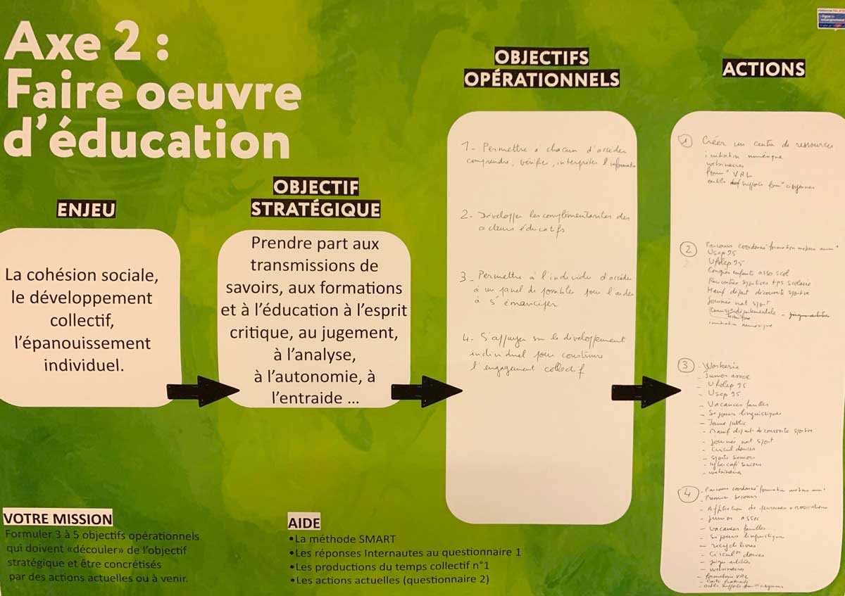 Pour réviser le projet fédéral de la Ligue 95, après un premier temps de travail en décembre, les adhérents, salariés, administrateurs et partenaires de la Ligue 95 étaient invités à une deuxième séance de réflexion collective le 15 février. Entre temps, le groupe de pilotage a dégagé trois axes stratégiques, sur la base des matériaux recueillis en décembre : « faire réseau », « faire œuvre d’éducation », « faire équipe ».