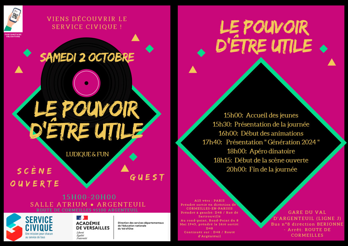 Sous la dénomination #LepouvoirDêtreUtile, les événements de promotion du service civique se multiplient en cette période de rentrée. Le 2 octobre à Argenteuil, le pôle d’appui départemental organise un grand rendez-vous avec la Mission locale, Pôle emploi et la participation de la municipalité. Au menu : séances de brainstorming, débats mouvants, jeux de rôle et stands, de 15h à 20h, salle Atrium.