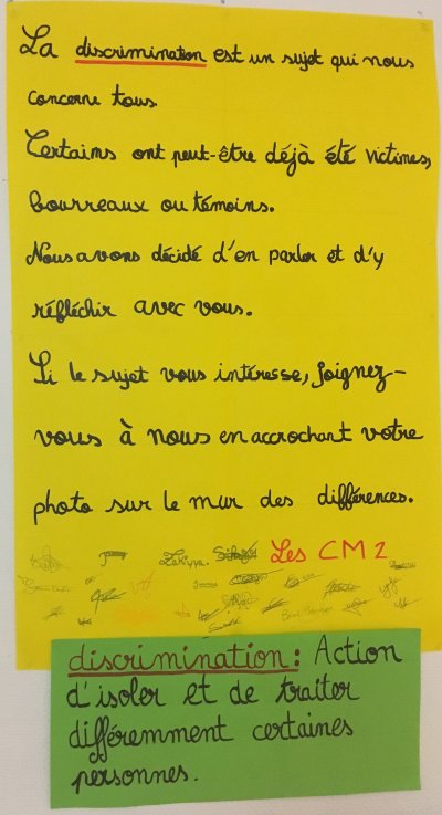 Ce débat a été matérialisé par une exposition au sein même de l’école : « Tous différents – Tous égaux ». Sur « le mur des différences », des smileys multicolores ont été accrochés. Chacun y a marqué un mot, une idée, qui pour lui peut être une source de discrimination ou du rejet d’un individu par la société. Ces mots font notamment référence à la différence des genres (filles / garçons), aux différences physiques, aux disparités religieuses, sociales, ethniques, etc. Ces « bonhommes de la diversité » sont assortis d’une affiche définissant ce qu’est la discrimination. Cette explication écrite sur papier vert est au préalable assortie des motivations et des enjeux corollaires à ce thèmes : « La discrimination est un sujet qui nous concerne tous. Certains ont peut-être déjà été victimes, bourreaux ou témoins. Nous avons décidé d’en parler et d’y réfléchir avec vous. »