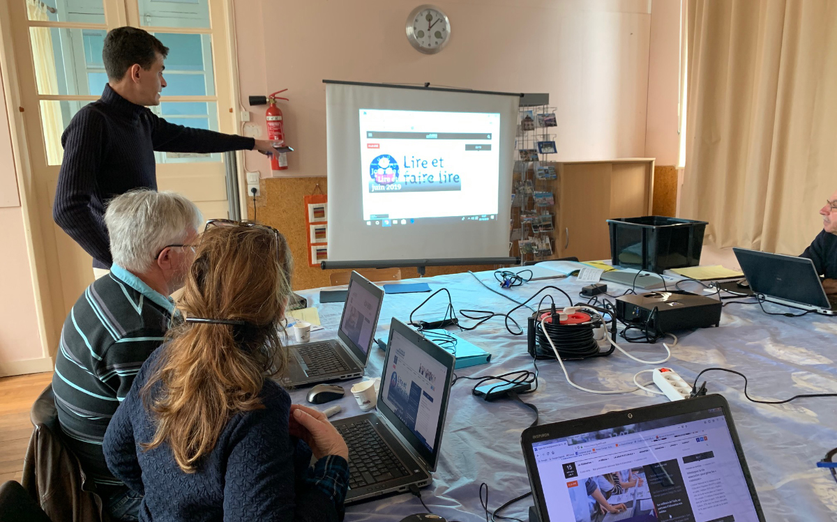 « Je ne sais pas comment mettre des choses sur Facebook », « Demain, je vais à Paris dans un endroit que je ne connais pas, mais je ne sais pas me servir de Google Map ». Abdel, l’animateur, invite les participants à essayer de résoudre les problèmes chacun depuis son ordinateur portable, tout en affichant les connexions sur grand écran. Ce matin-là, à la mairie de Nucourt, une poignée de seniors studieux, mais décontractés, participe au cybercafé, organisé toutes les semaines par l’association Adapte 95. Seraincourt, Boissy-l’Aillerie, Haravilliers et Moussy sont les autres communes bénéficiaires de ces ateliers hebdomadaires aujourd’hui. Voilà bientôt un an que ces rendez-vous sont proposés gratuitement aux retraités du Vexin, dans le cadre de Ensemble pour participer à la lutte contre la fracture numérique et l’isolement des seniors en milieu rural.