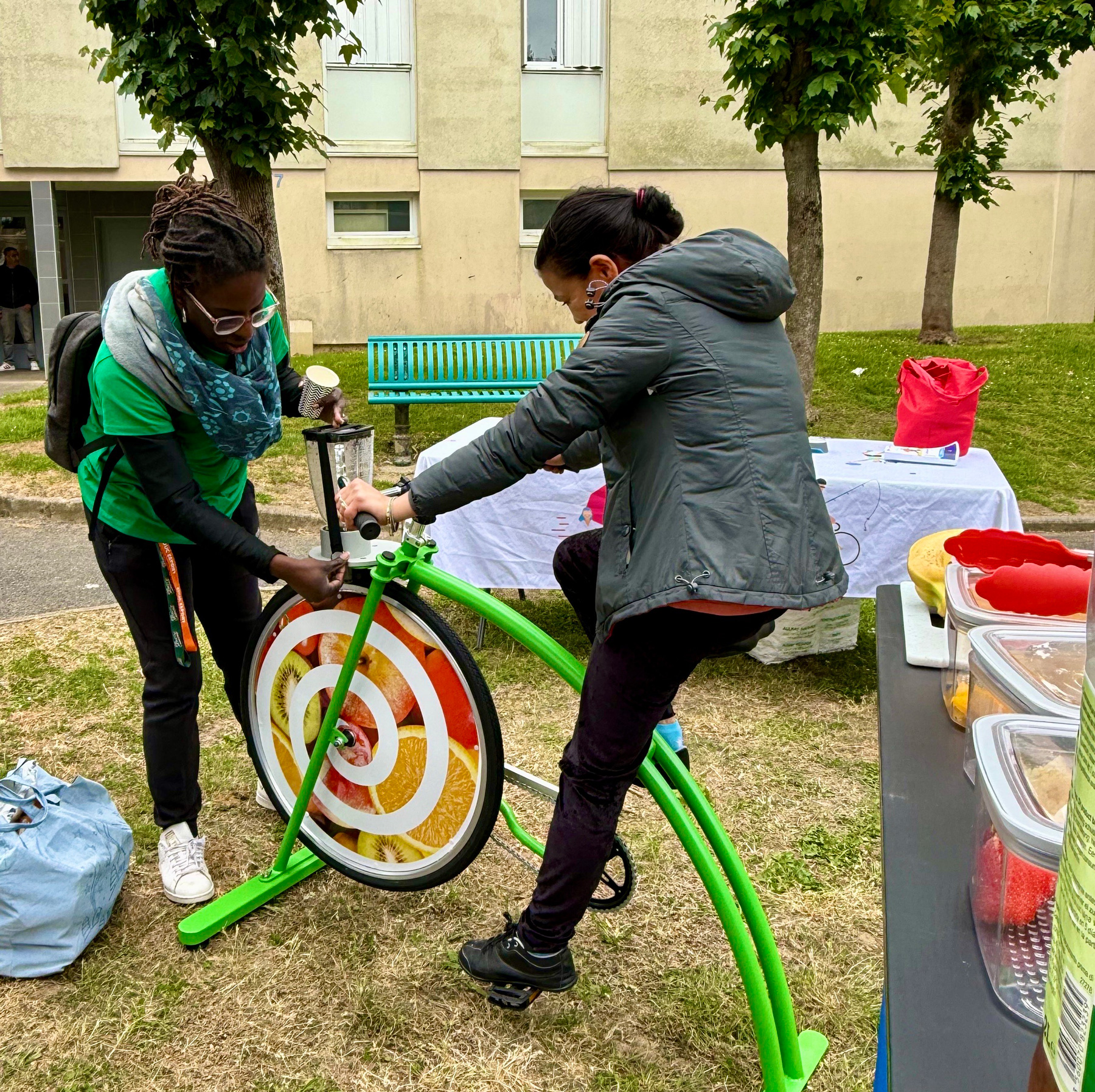 Illustrant à merveille l’objectif sport santé de l’association, un vélo smoothie a fait son apparition à l’Ufolep 95. Le concept est simple : pour mixer les fruits disposés dans un blender fixé à l’avant du guidon, il faut pédaler ! L’énergie est produite par une dynamo reliée à la roue avant.